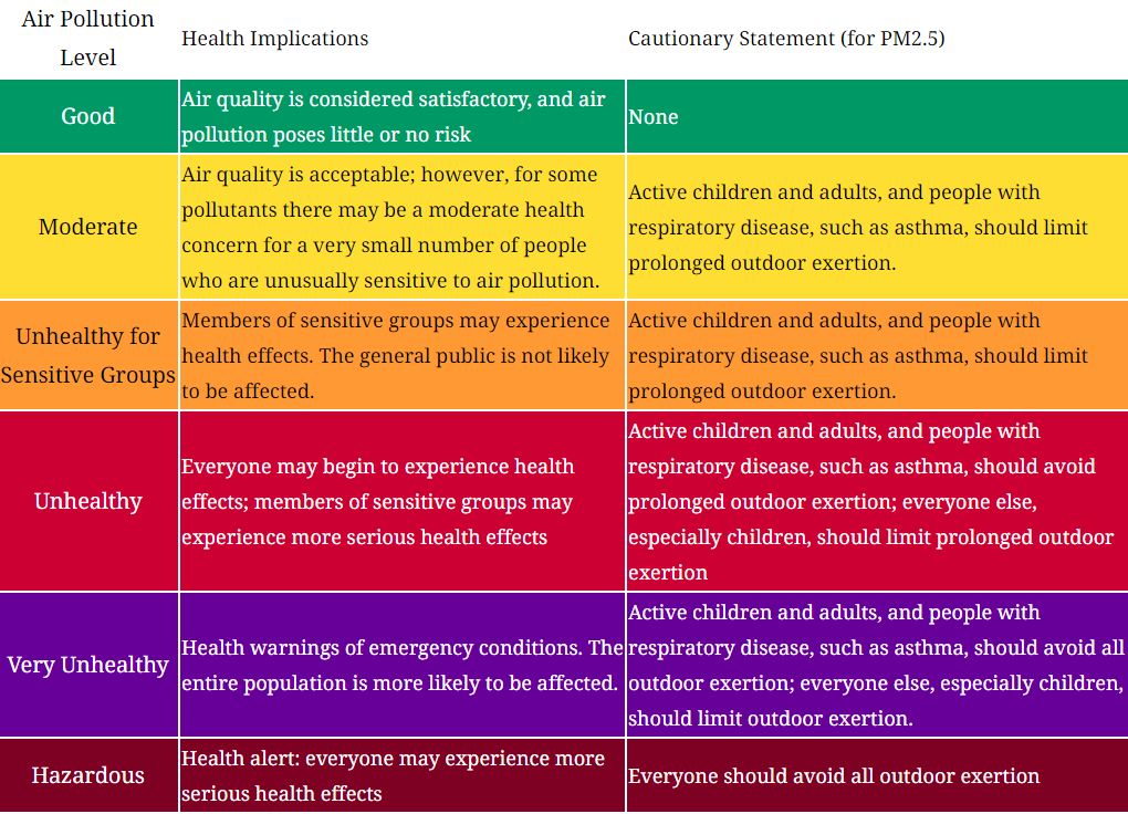 Wie man sehen kann unterscheiden diese sich scheinbar hauptsächlich darin, wie die jeweilige Konzentration interpretiert, sprich einem AQI Wert zugeordnet wird. Die Farben / AQI Werte haben folgende Bedeutung dann einheitlich folgende Bedeutung: