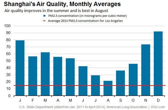 Schwierig zu beantworten … Ich habe leider keine verlässlichen Angaben dazu gefunden an wie vielen Tagen im Jahr Werte von 150 überschritten werden. Das ist für mich so der Wert wo ich sage, dass ich beginne die Auswirkungen zu spüren. Tendenziell ist es im Sommer weniger schlimm als im Winter. Regen wäscht die Luft rein stimmt tatsächlich, insofern ist die Luft an Regentagen die beste. HealthAndSafetyInShanghai gibt, leider ohne Quellenangabe, an, dass im ersten Halbjahr 2016 wir 130 Tage mit einem AQI von unter 100 hatten. Gefühlt stimme ich zu, es war dieses Jahr relativ gut, lediglich gegen Ende nahm die Verschmutzung wieder zu. Weitere Ausführungen zu der aktuellen Situation in Shanghai von HealthAndSafetyInShanghai. Eine von Wall Street Journal veröffentlichte Grafik einer Statistik der American Lung Association zeigt in den historischen Daten von 2011-2014 ebenfalls, dass die Situation im Sommer besser und im Winter schlimmer ist.